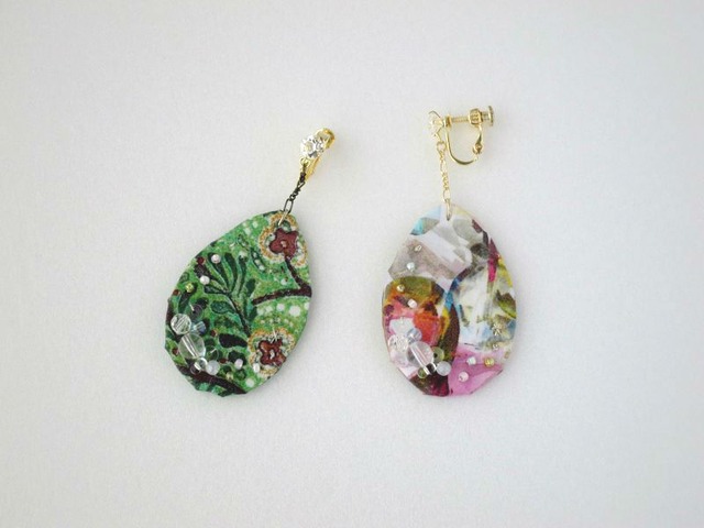 存在感のあるColor drop 片耳イヤリング スタイリングにも映えてお顔周りを可愛く飾ります ドロップモチーフはLIBERTY Fabricでつくり 「Alexandra」と「David Joe」の2柄 Alexandraは、マルチカラーの宝石柄。 大きめのビジュー柄でピンクやブルーやイエローと カラフルな宝石模様のリバティプリントが スタイルのポイントになります David Joeは、緑の木々がたくさんある森柄 様々な葉っぱの楕円や丸が可愛く、涼やかな森模様が スタイルのポイントになります どちらも、耳たぶにはきらきらと光るビジュー型のクリスタルガラス イヤリング金具は耳たぶへの圧を調節できるネジバネ式です ドロップ部分にはカットガラスやクリアパーツ グラスビーズが散りばめられて 視線をあつめる耳元に 髪をアップにする暑い季節に、軽やかな装いに合わせて 髪をおろしている寒い季節に、色をプラスしたり、 オールシーズン活躍する可愛い片耳イヤリングです color:マルチビジュー/グリーンフォレスト ※画像と柄の出方が変わる場合があります - - - - - - - - - - - - - - - - - - - - - - - - - - 素材:ガラス、樹脂、真鍮 イヤリング:ネジバネ式 サイズ:横約3㎝/縦約6.5㎝ 耳部分ビジュー型クリスタル0.5㎝ - - - - - - - - - - - - - - - - - - - - - - - - - - by Pastel forest -メリーゴーラウンドの廻る森- ※画面上と実物では色が異なって見える場合があります。ご不明な点がありましたらお問い合わせください