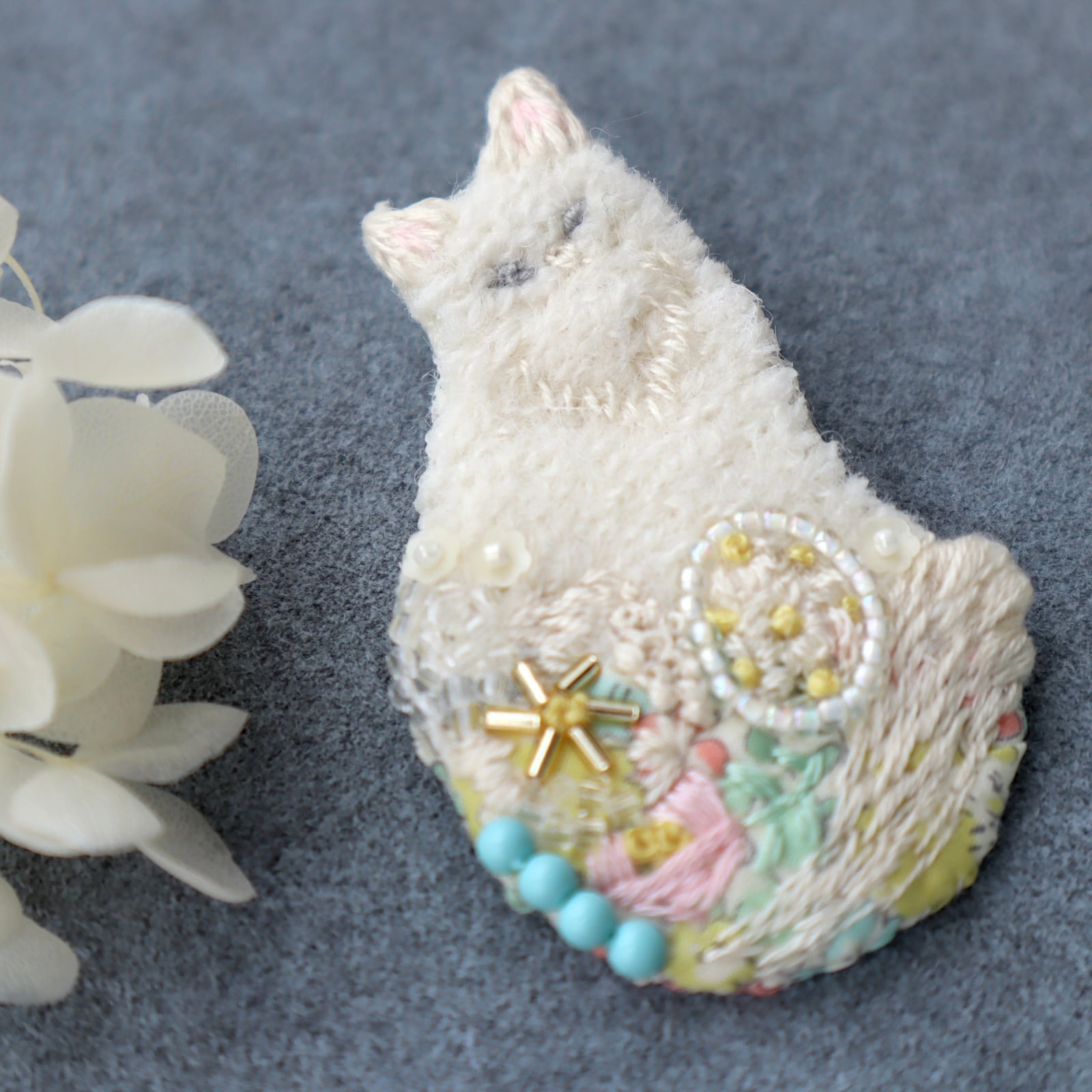 森ねこブローチ 白ねこ(長毛種) / 花々の記憶柄