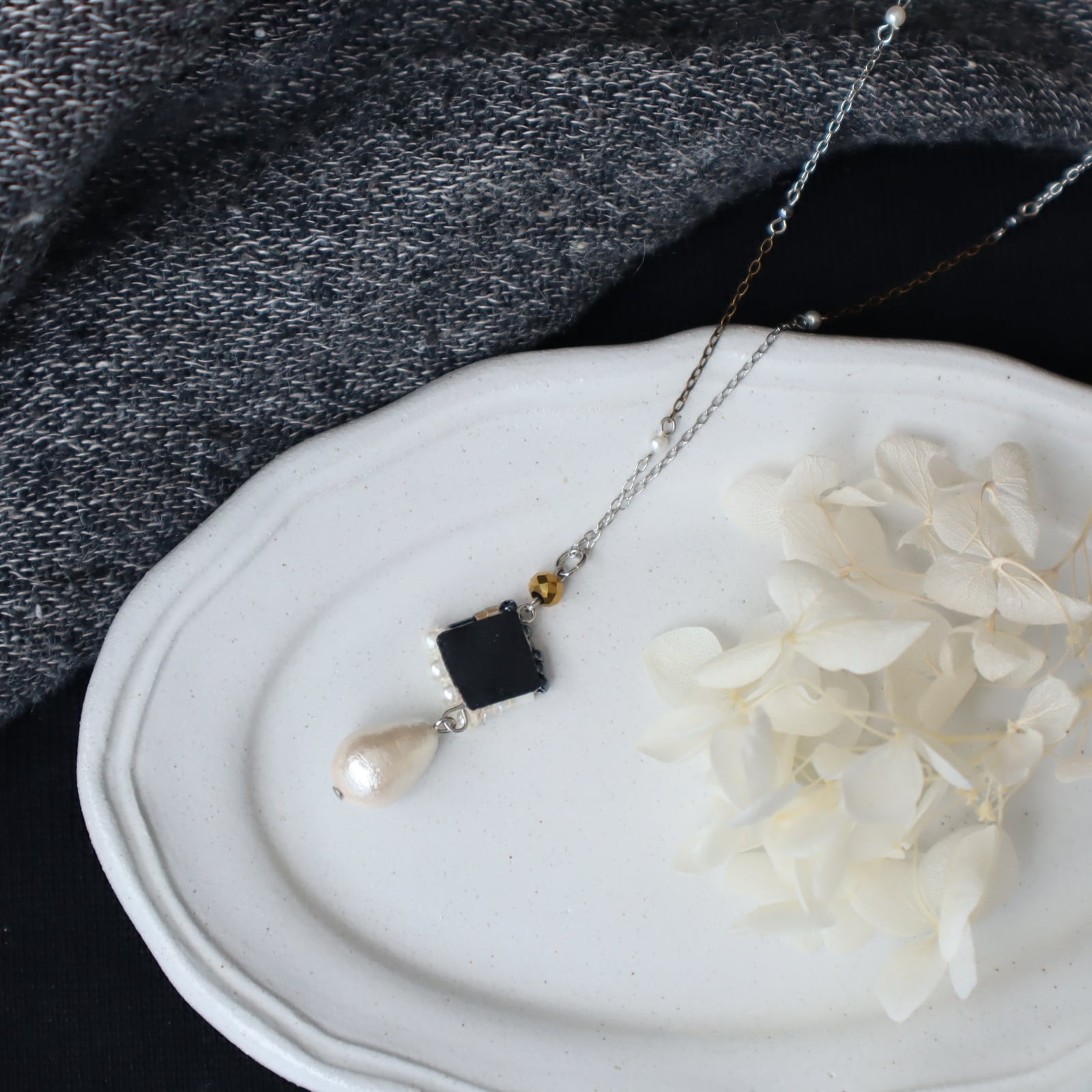 主な素材:コットンパール、グラスビーズ(ガラス)、ガラスパーツ、パール、チェーン