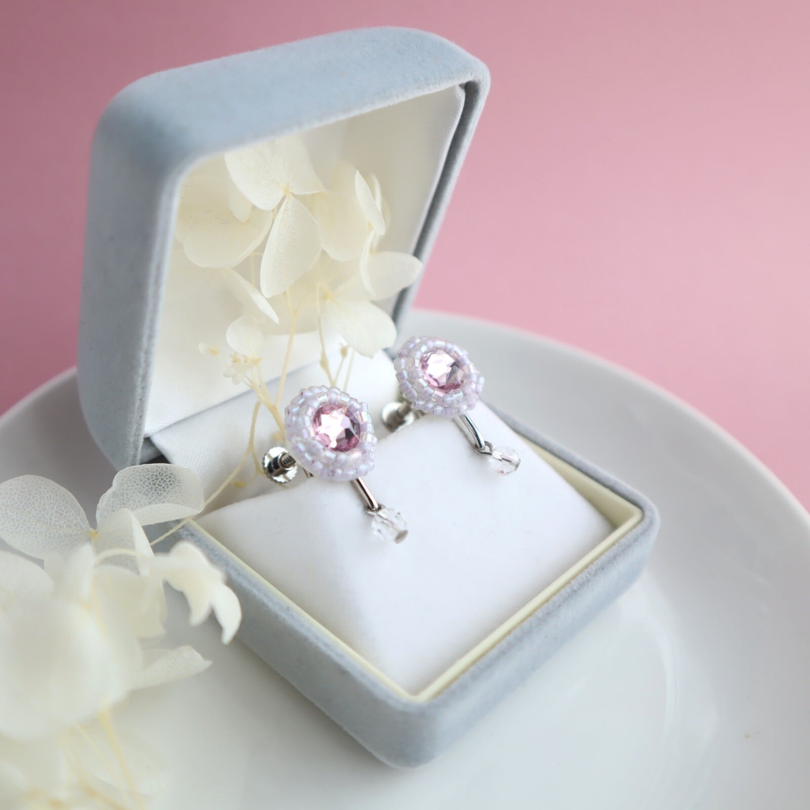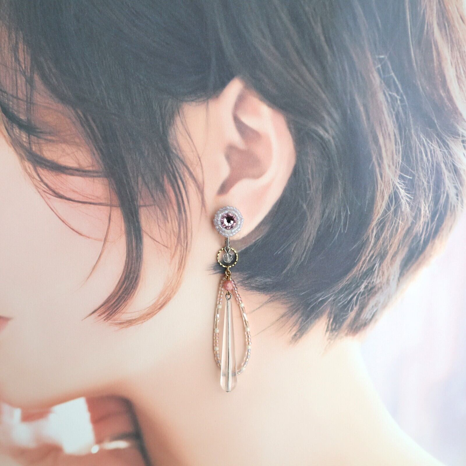 ヨーロッパのメーカーで生産されている輝きが美しいクリスタルのまわりには小粒のビーズをひとつぶひとつぶ縫い留めて。ぶら下がりパーツには、装いと肌になじむ透明なロングパーツ。かこむように寄り添うのは柔らかなピンクを集めた小粒なグラスビーズがきらきら ✧ ˚