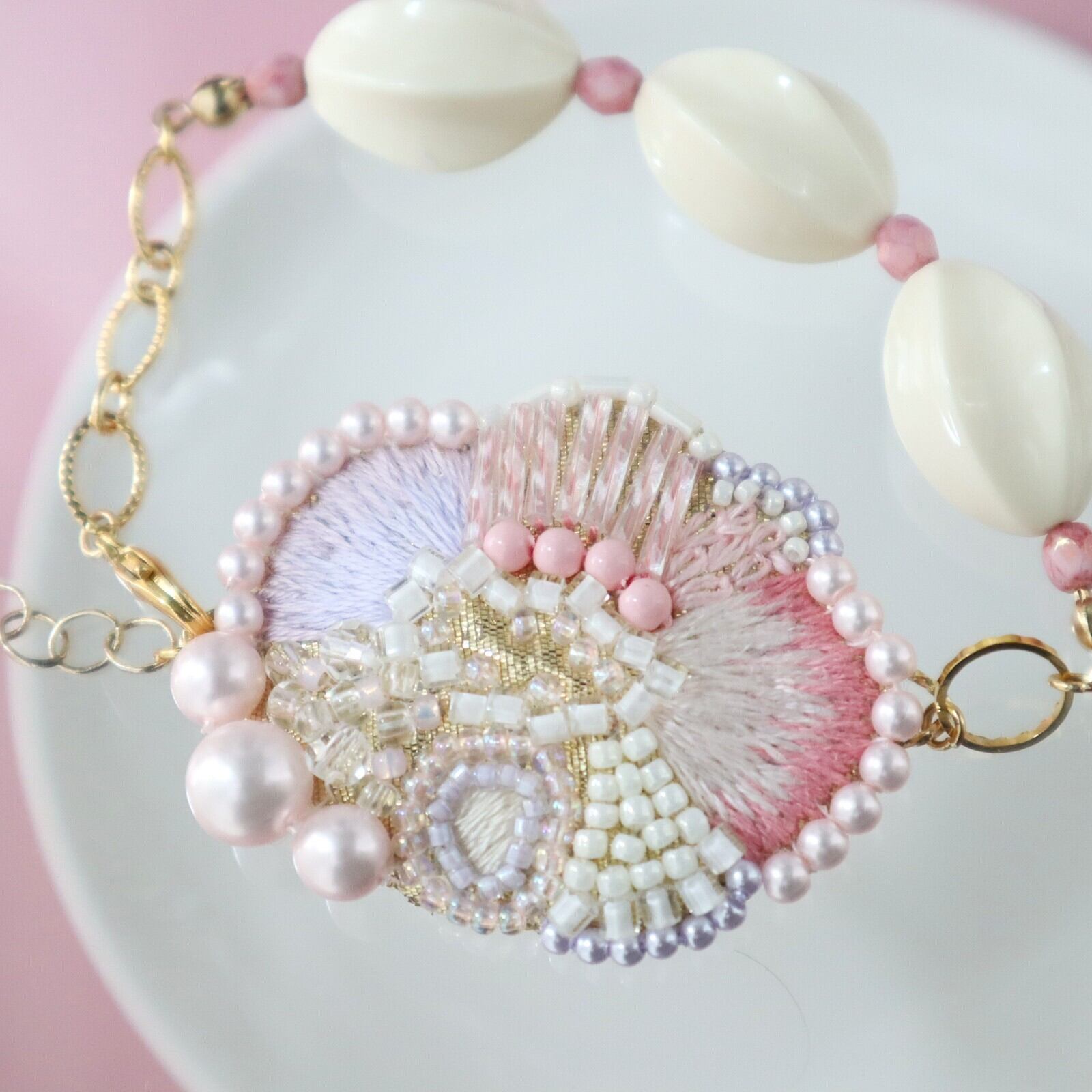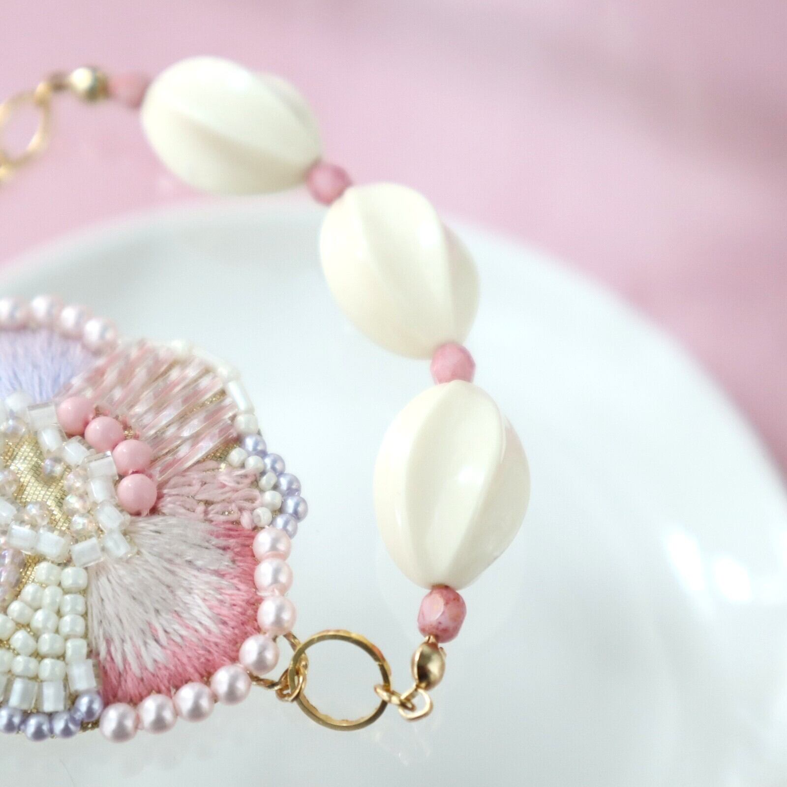 ・軽い布ベースにグラデーションの刺繍、小粒ビースをひとつぶひとつぶ縫い留めています