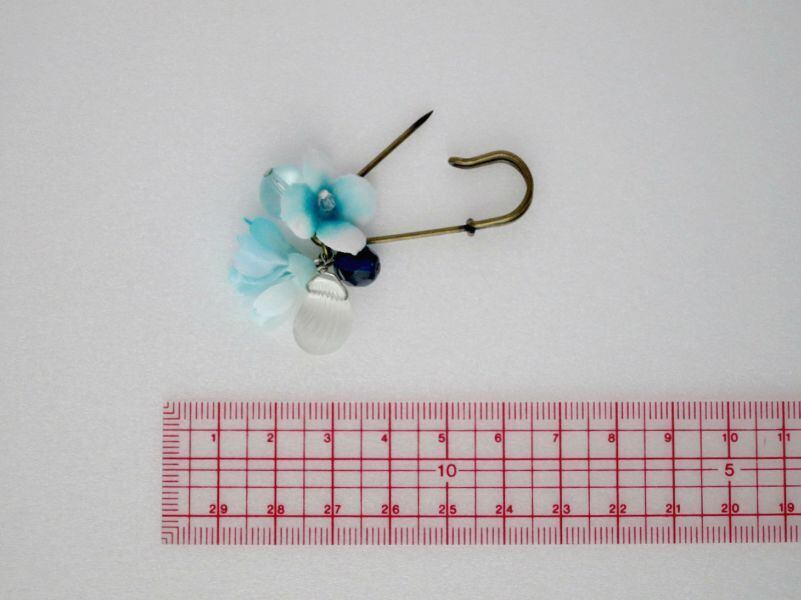 爽やかな海の青い花々とクリスタルガラスシェルのブローチ。